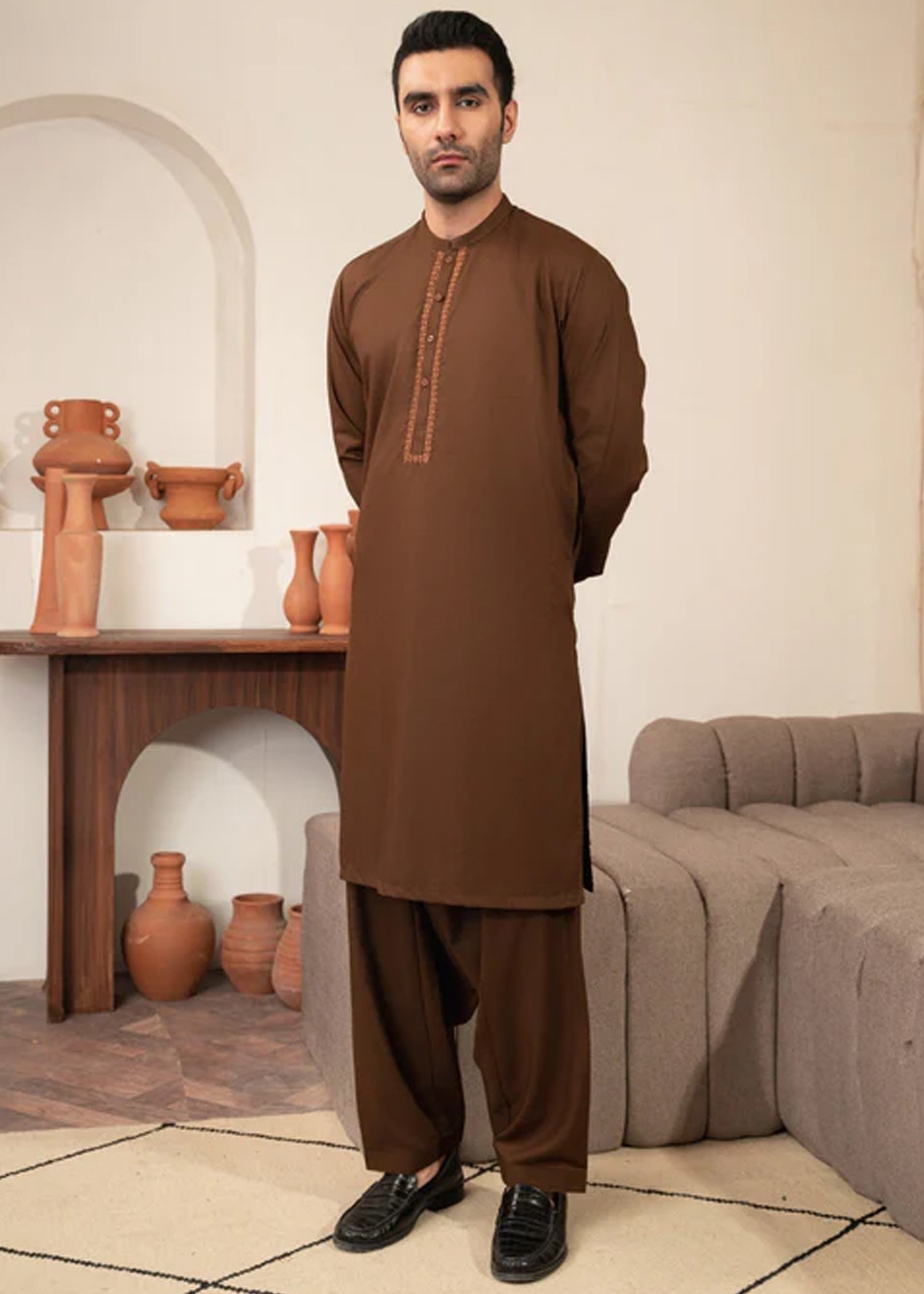 Camel Brown Collar Plain - Kameez Shalwar - Men